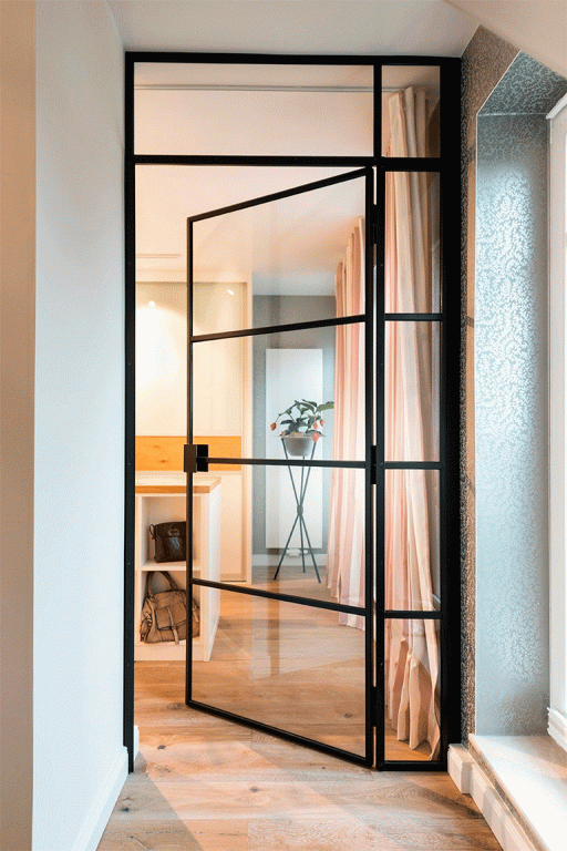 - Комбинация со стеклом и деревом или металлом: комбинированные двери украшают интерьер, сохраняя основную функцию прозрачности и лёгкости.